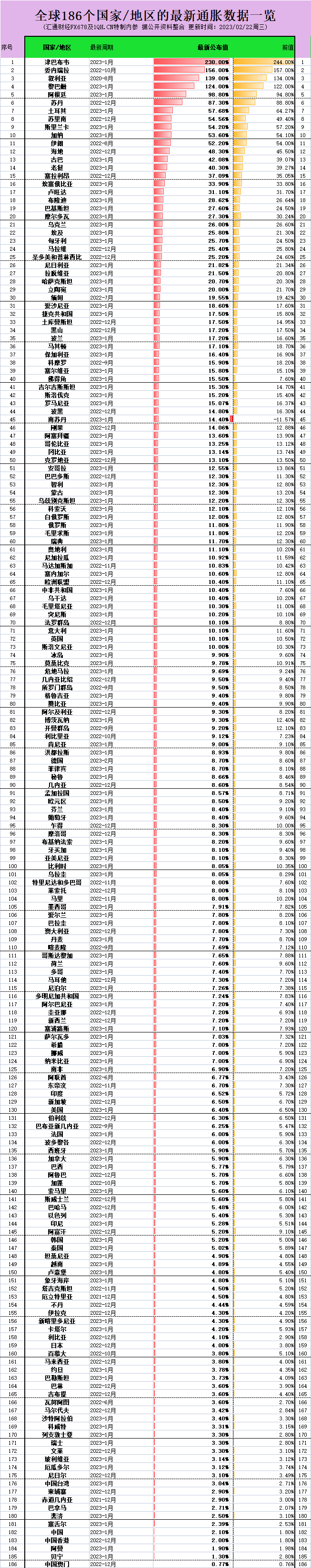 全球186个国家/地区“通胀排行榜”一览,美联储纪要前多国提“高通胀”