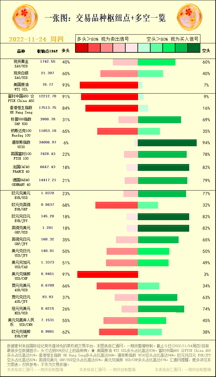一张图:交易品种枢纽点+多空占比一览。截止今日(2022/11/24周四)目前最新多空数据显示,头寸达到80%及以上的品种有:★ 美国原油 WTI OIL多头占比高达93%。富时中国A50 ☆FTSE...