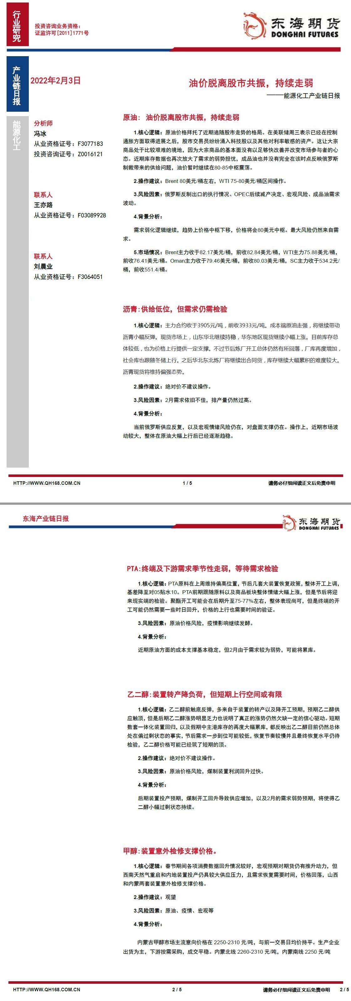 汇通财经APP讯——原油:油价脱离股市共振,持续走弱沥青:供给低位,但需求仍需检验PTA:终端及下游需求季节性走弱,等待需求检验乙二醇:装置转产降负荷,但短期上行空间或有限甲醇:装置意外检修支撑价格L...