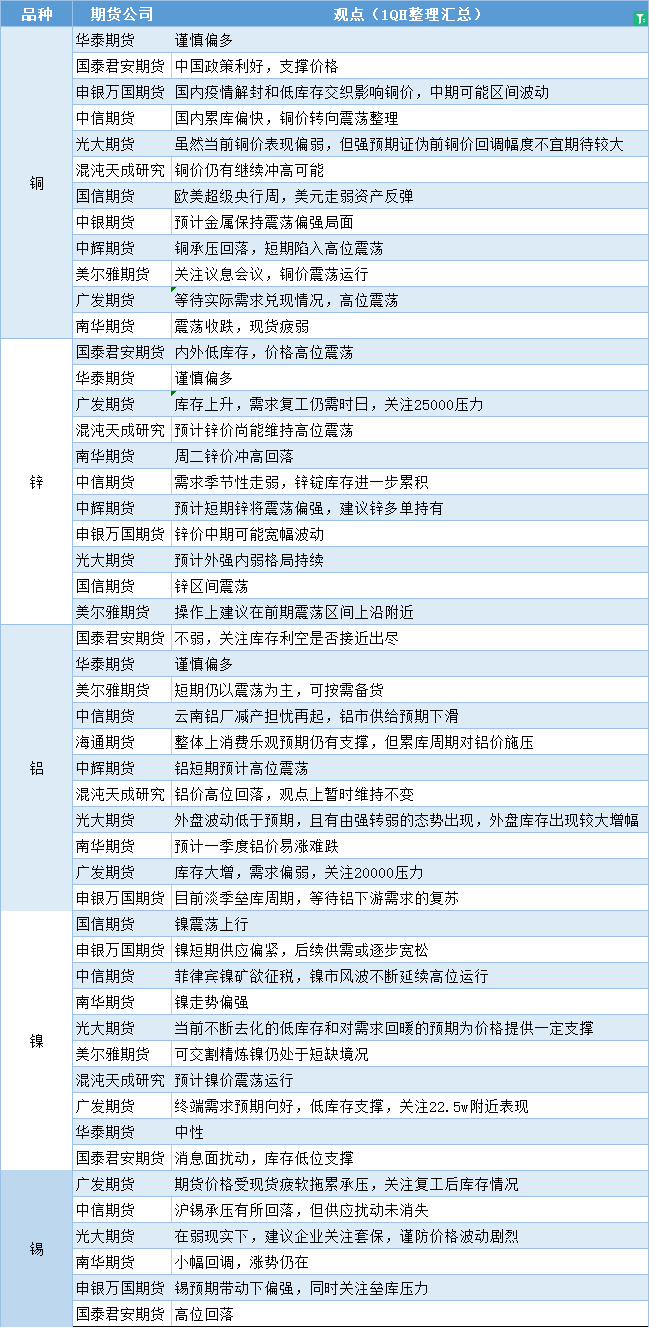 汇通财经APP讯——期货公司观点汇总一张图:2月1日有色系(铜、锌、铝、镍、锡等)
