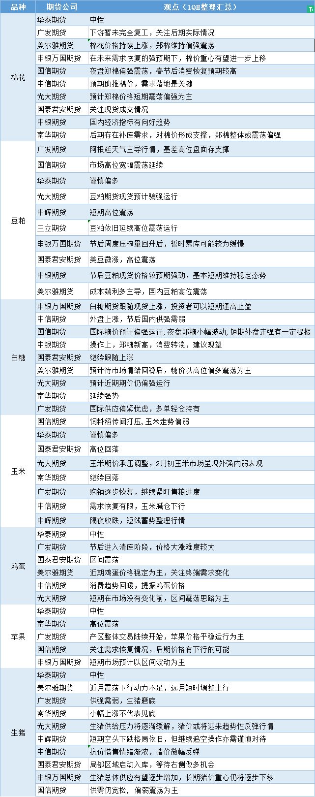 汇通财经APP讯——期货公司观点汇总一张图:2月1日农产品(棉花、豆粕、白糖、玉米、鸡蛋、生猪等)