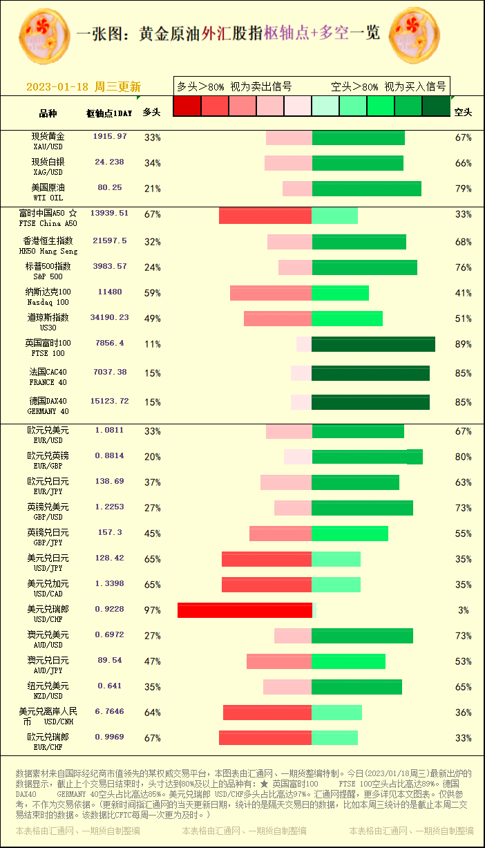 汇通财经APP讯——一张图:黄金原油外汇股指"枢纽点+多空占比"一览。今日(2023/01/18周三)最新出炉的数据显示,截止上个交易日结束时,头寸达到80%及以上的品种有:★ 英国富时100 FTS...