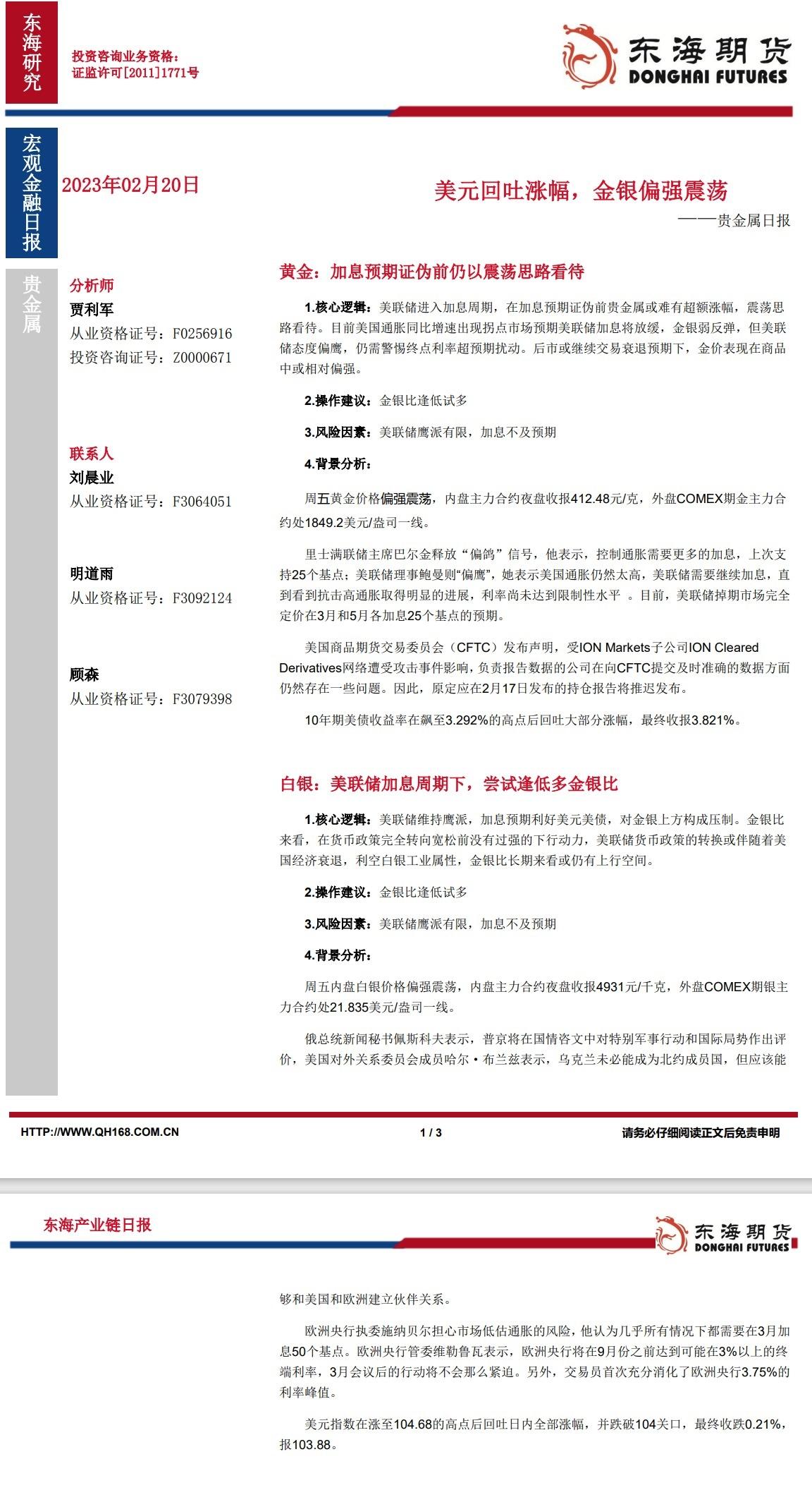 汇通财经APP讯——黄金:加息预期证伪前仍以震荡思路看待。白银:美联储加息周期下,尝试逢低多金银比。东海期货公司授权文本由“专注期货开户交易及专业行情分析资讯网站”:【一期货 www.1qh.cn】转...