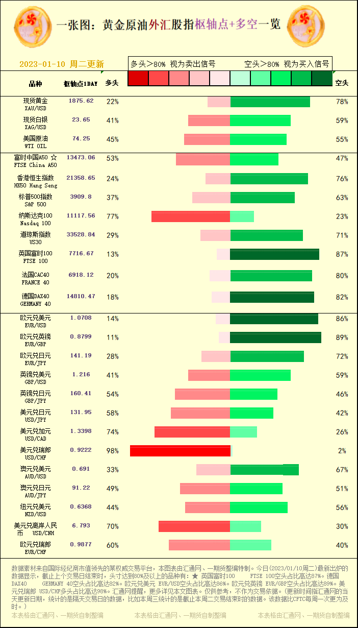 汇通财经APP讯——一张图:黄金原油外汇股指"枢纽点+多空占比"一览。今日(2023/01/10周二)最新出炉的数据显示,截止上个交易日结束时,头寸达到80%及以上的品种有:★ 英国富时100 FTS...