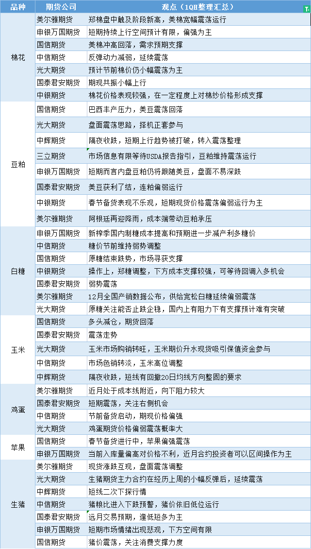 汇通财经APP讯——期货公司观点汇总一张图:1月10日农产品(棉花、豆粕、白糖、玉米、鸡蛋、生猪等)