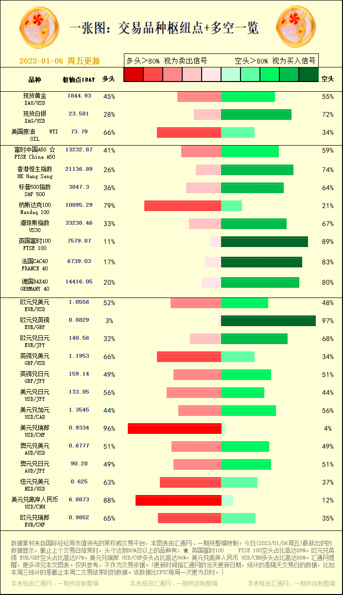 汇通财经APP讯——一张图:黄金原油外汇股指"枢纽点+多空占比"一览(2023/01/06周五)。今日(2023/01/06周五)最新出炉的数据显示,截止上个交易日结束时,头寸达到80%及以上的品种有...