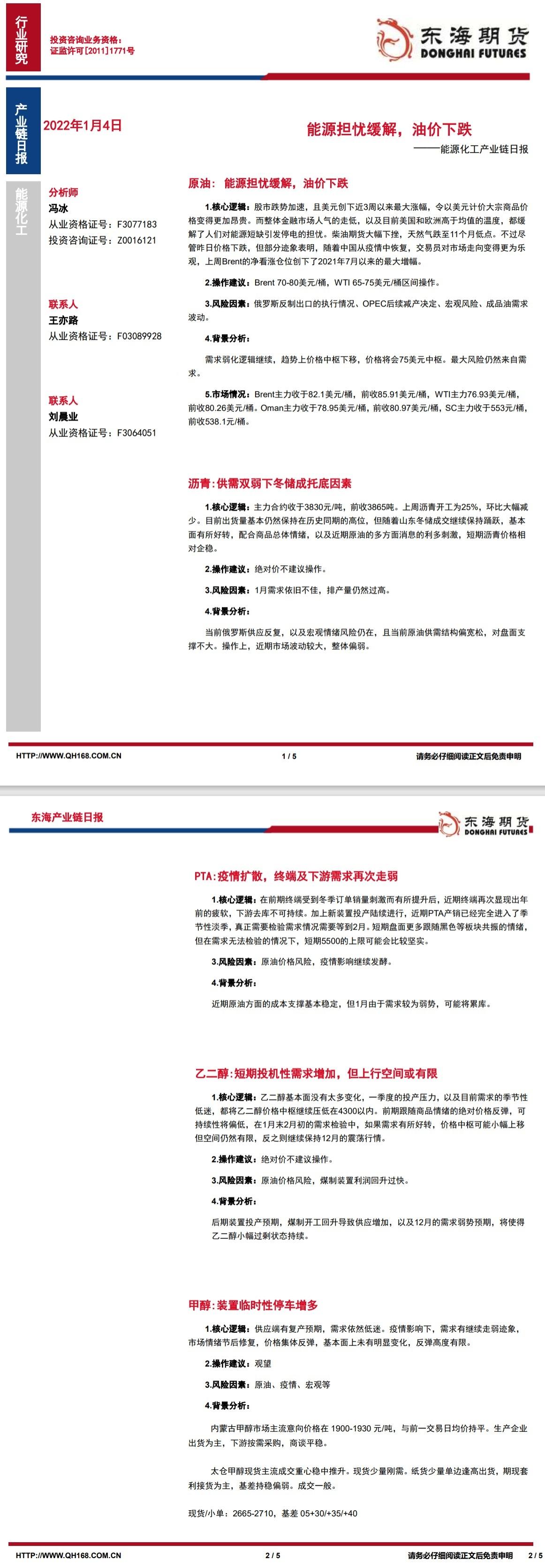 汇通财经APP讯——原油: 能源担忧缓解,油价下跌。沥青:供需双弱下冬储成托底因素。PTA:疫情扩散,终端及下游需求再次走弱。乙二醇:短期投机性需求增加,但上行空间或有限。甲醇:装置临时性停车增多。L...