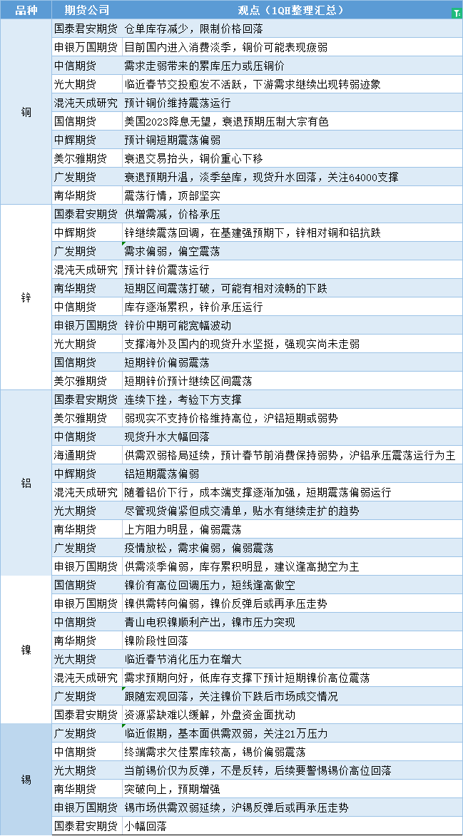 汇通财经APP讯——期货公司观点汇总一张图:1月5日有色系(铜、锌、铝、镍、锡等)
