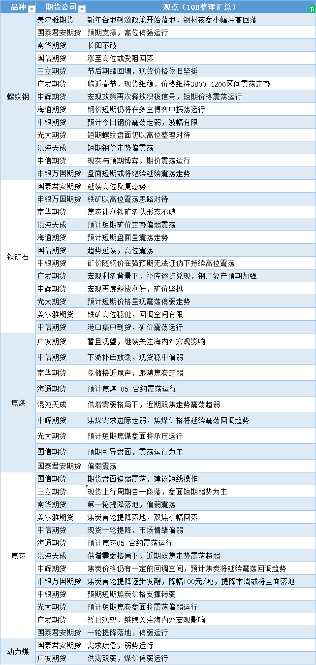 汇通财经APP讯——期货公司观点汇总一张图:1月4日黑色系(螺纹钢、焦煤、焦炭、铁矿石、动力煤等)