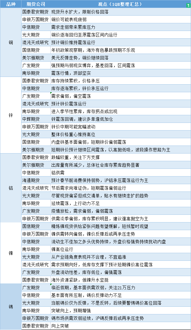 汇通财经APP讯——期货公司观点汇总一张图:1月4日有色系(铜、锌、铝、镍、锡等)
