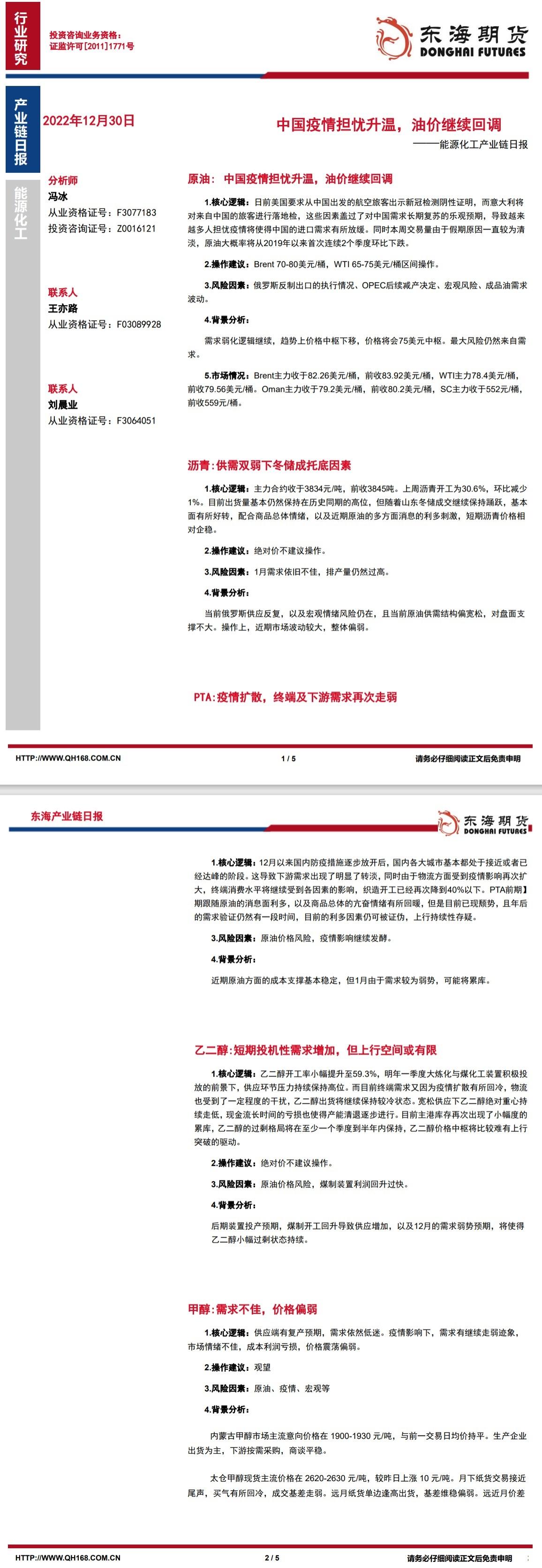 汇通财经APP讯——原油: 中国疫情担忧升温,油价继续回调。沥青:供需双弱下冬储成托底因素。PTA:疫情扩散,终端及下游需求再次走弱。乙二醇:短期投机性需求增加,但上行空间或有限。甲醇:需求不佳,价格...