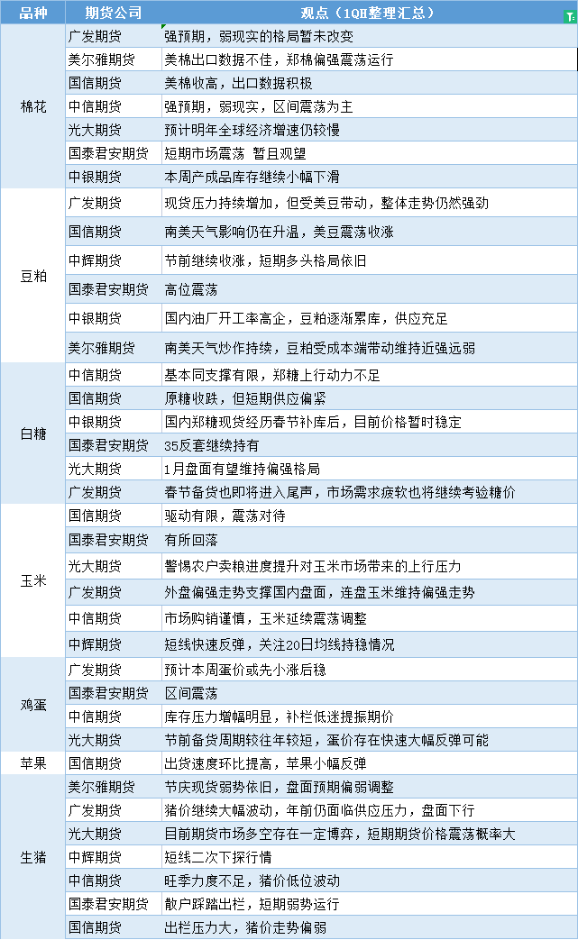 汇通财经APP讯——期货公司观点汇总一张图:1月3日农产品(棉花、豆粕、白糖、玉米、鸡蛋、生猪等)