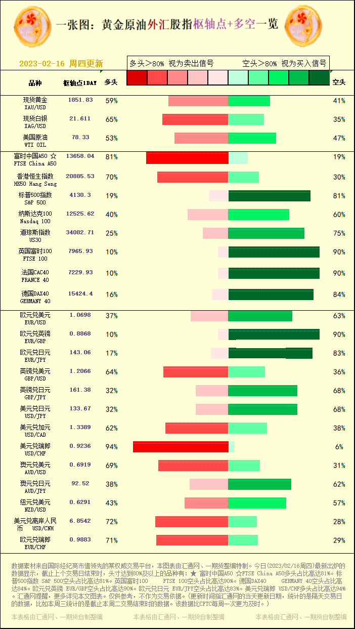 汇通财经APP讯——一张图:黄金原油外汇股指"枢纽点+多空占比"一览。今日(2023/02/16周四)最新出炉的数据显示,截止上个交易日结束时,头寸达到80%及以上的品种有:★ 富时中国A50 ☆FT...