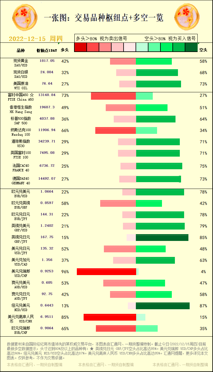 汇通财经APP讯——一张图:交易品种枢纽点+多空占比一览。截止今日(2022/12/15周四)目前最新多空数据显示,头寸达到80%及以上的品种有:★ 英镑兑日元 GBP/JPY空头占比高达85%。美元...