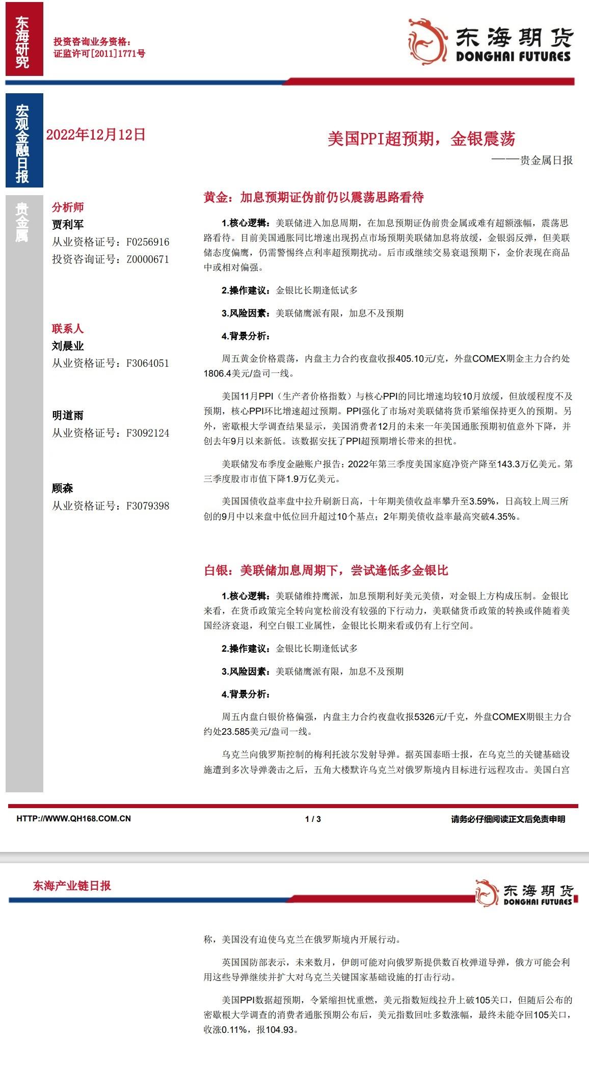 汇通财经APP讯——黄金:加息预期证伪前仍以震荡思路看待。白银:美联储加息周期下,尝试逢低多金银比。东海期货公司授权文本由“专注期货开户交易及专业行情分析资讯网站”:【一期货 www.1qh.cn】转...