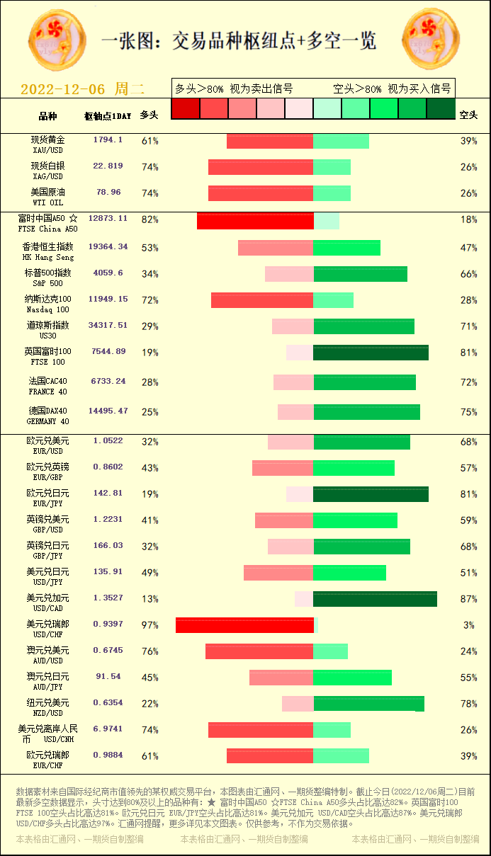 汇通财经APP讯——一张图:交易品种枢纽点+多空占比一览。截止今日(2022/12/06周二)目前最新多空数据显示,头寸达到80%及以上的品种有:★ 富时中国A50 ☆FTSE China A50多头...