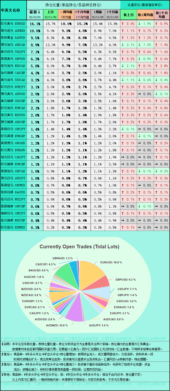 汇通财经APP讯——一张图:黄金及外汇等30品种持仓比重及变动一览。截止今日(2022/12/01)目前,★30个品种中,持仓比重最新值最高的是:欧元美元 EURUSD 16.1%,第二高的是:澳元纽...