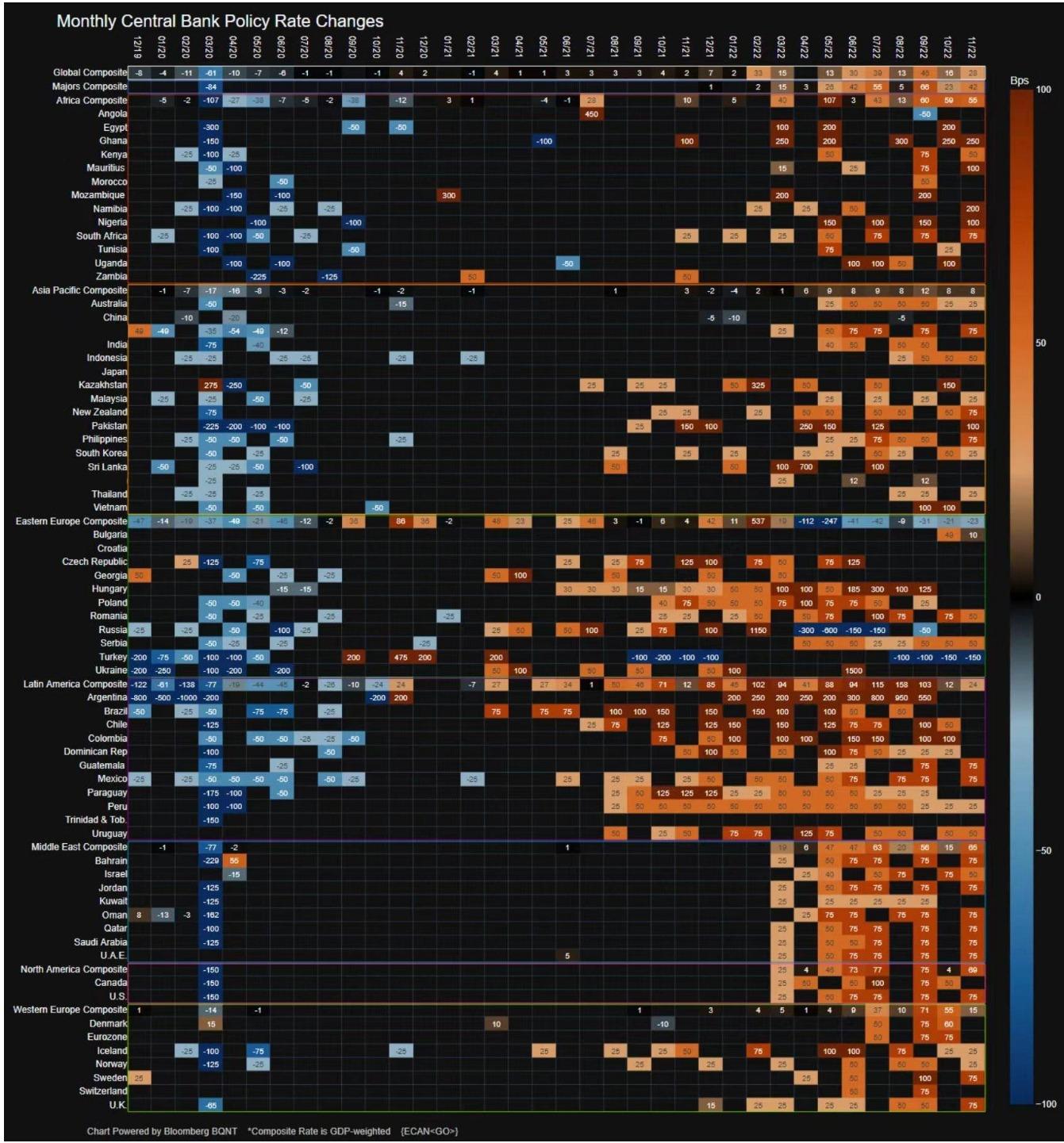 下图是业内最齐全的一份过去三年间(2019年12月-2022年11月),全球央行的政策利率变动的情况: