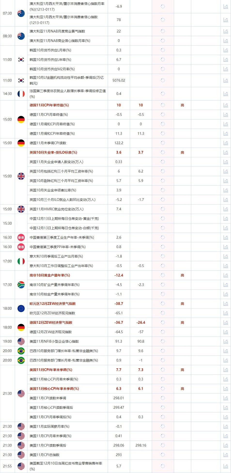 21:30?美国11月CPI年率未季调(%)?,?前值?7.7?,?预期值?7.3?,?公布值:待发布