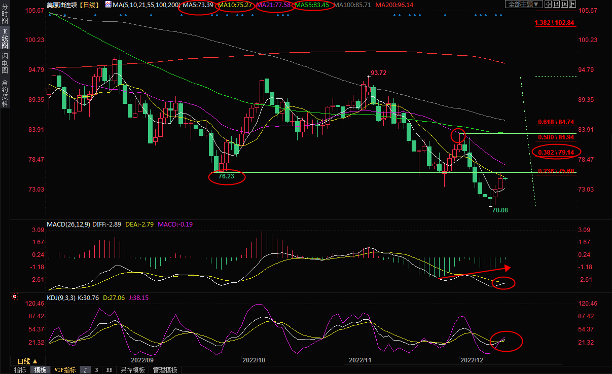 日线级别:单边下跌后反弹;油价在70整数关口附近录得“希望之星”后延续涨势,KDJ初步金叉,MACD底背离后也有金叉趋势,油价见底信号进一步增强,目前油价这个试探10日均线阻力,上方关注21日均线77.59附近阻力,如果顶破该阻力,则有望进一步试探80整数关口附近阻力,93.72-70.08跌势的38.2%回撤位79.14附近阻力也需要予以留意,中线目标位参考55日均线83.45附近位置,12月1日高点阻力也在该位置附近。