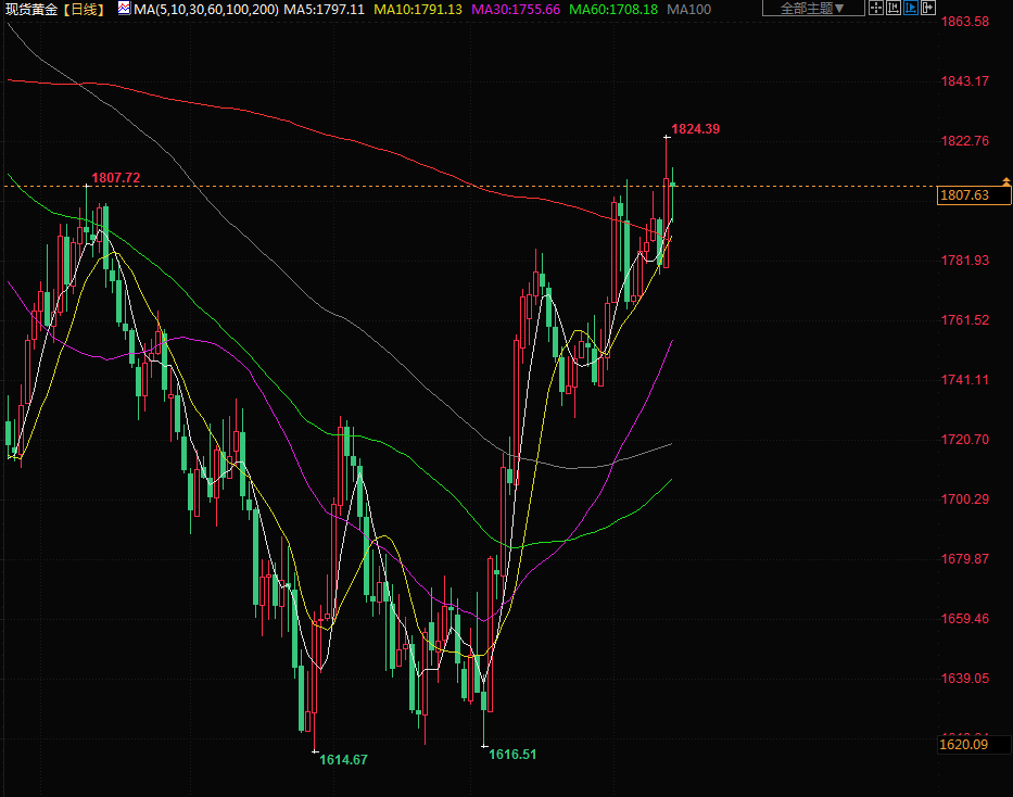 Heraeus?Precious?Metals的高级交易员Tai?Wong说,“黄金未理会点阵图中的鹰派信号以及鲍威尔关于明年不会降息的明确警告,收复了联储决定公布之初的所有跌幅,美元疲软当然也带来帮助。市场认为最终美联储将是一只纸老虎,一旦出现经济衰退或失业率升高,立场就会软化,”Wong说,并补充称目前还不清楚黄金能否反弹到本周高点1824美元之上。