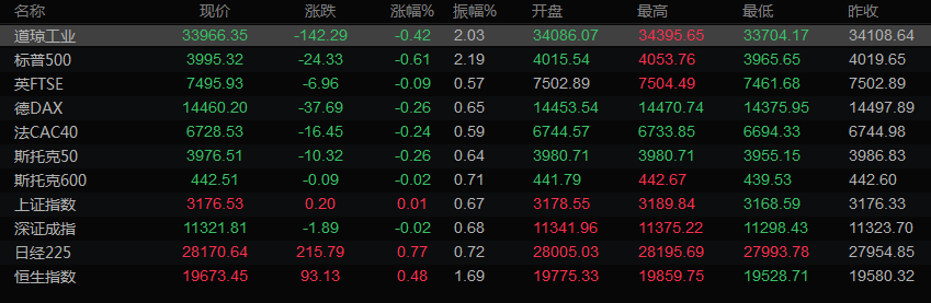 美股收盘情况:道琼斯指数收盘下跌0.42%,报33965.69点;标普500指数收盘下跌0.61%,报3995.00点;纳斯达克综合指数收盘下跌0.76%,报11170.89点。