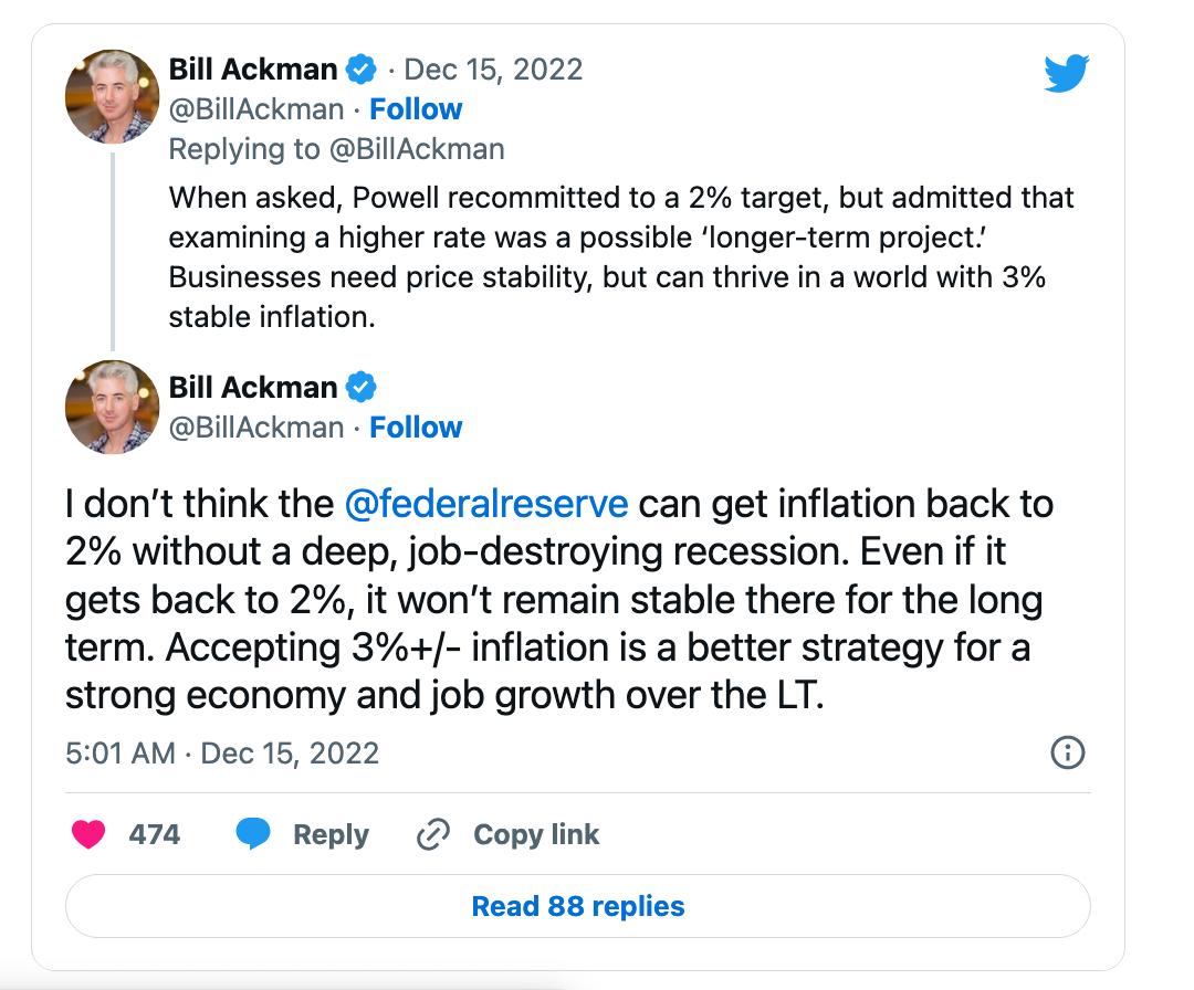 今年早些时候,阿克曼支持美联储采取激进行动,并呼吁7月加息整整100个基点。他的公司通过押注利率上升获利颇丰,今年赚了近20亿美元,自2020年新冠疫情爆发以来赚了52亿美元。