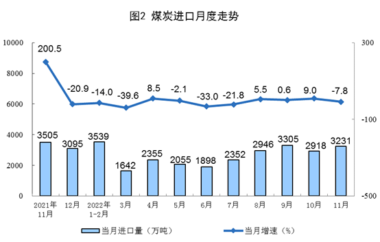 原煤生产增速加快,进口由升转降。为做好今冬保暖保供工作,原煤生产企业持续加大增产增供力度。11月份,生产原煤3.9亿吨,同比增长3.1%,增速比上月加快1.9个百分点,日均产量1304万吨。进口煤炭3231万吨,同比下降7.8%,上月为增长9.0%。