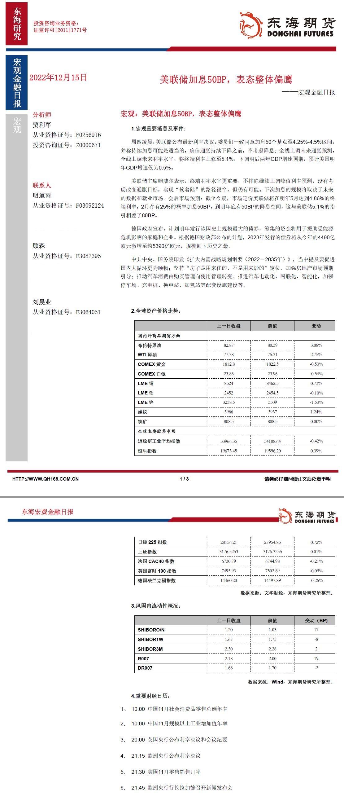 标题:【东海期货12月15日宏观金融日报】美联储加息50BP,表态整体偏鹰