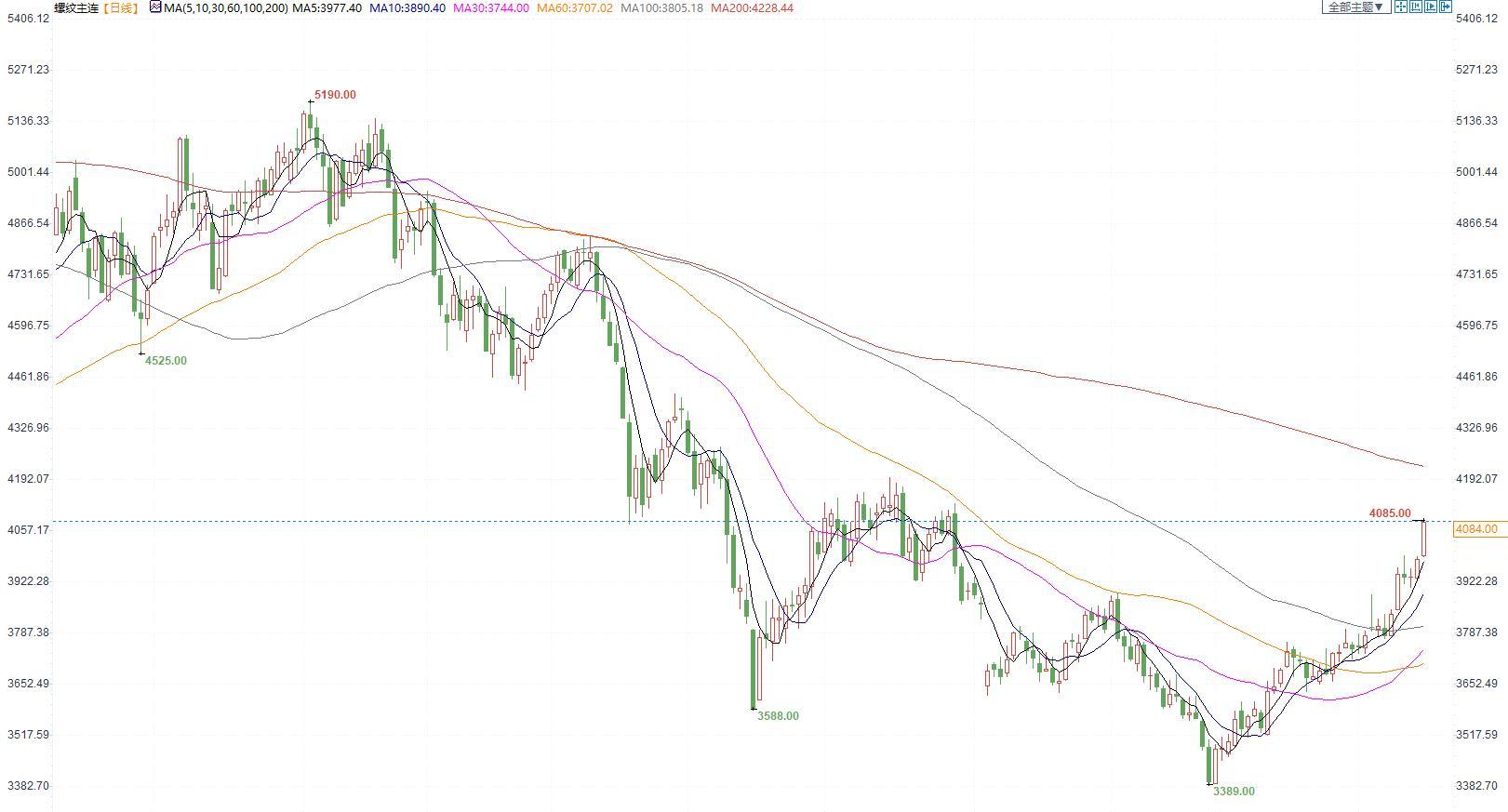 价格:螺纹钢整体强势上行,自夜盘走强后,今天白天震荡回调后再次上行,冲高位4085,日K收大阳线,收盘价4084元/吨,大幅上涨3.31%。受期货盘面提振,现货市场今日也出现大幅上涨,上海中天现货价3980元/吨,环比增加80元/吨。