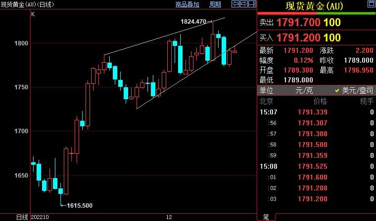 北京时间15:22,现货黄金下沉0.03%至1792.14美元/盎司;COMEX期金主力合约上浮0.11%至1802.1美元/盎司;美元指数下跌0.37%至104.415。