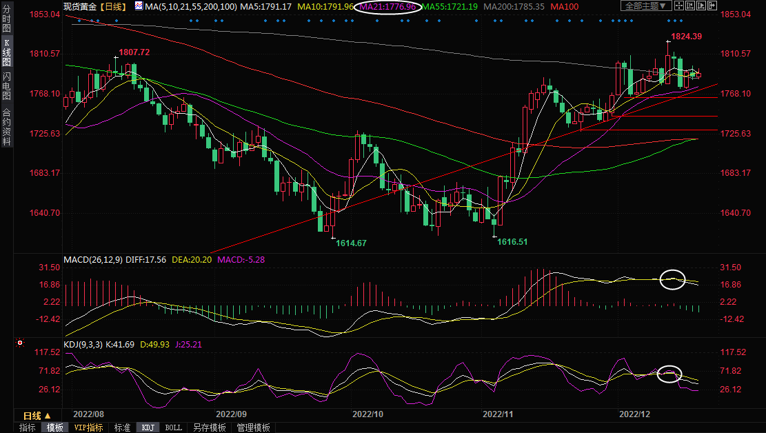 日线级别:高位震荡;MACD顶背离后死叉,KDJ轻微死叉,短期均线趋于交织,短线走势变数较大,留意1776.95-1800区域突破情况,顶破1800关口前,后市略微偏向震荡下行,如果跌破21日均1776.95附近支撑,则增加短线看空信号;进一步支撑在12月5日低点1765.72附近,11月30日低点支撑在1744.79附近,1616-1824涨势的38.2%回撤位支撑也在该位置附近。