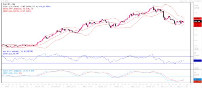 周一(12月19日),美元兑日元略微上涨0.14%,收盘于136.90。主要是当日美债收益率有所回升,令美元兑日元产生反弹。美联储包括主席鲍威尔上周对于加息继续保持强硬态度,即通胀不大目标,加息不止。尽管如此,金融市场似乎对美联储的鹰派立场并不买账。联邦基金期货市场已经对2023年底前的降息进行了定价。多伦多Corpay的首席市场策略师KarlSchamotta说:“很少有人预计美联储会兑现周三的鹰派立场?!苯衲暌岳矗捎诿懒⒋罅酉?,吸纳资金回流到以美元计价的债券,该指数已经飙升了约9%。然而,自9月份创下20年高点以来,美元指数已经下跌了约8%,因为美国通胀放缓,使人们对美联储的加息周期可能很快结束产生了希望。而目前日本央行似乎也有想让其货币政策回归正常的苗头。因此,日元在年底前料不会出现大幅走弱的机会。日线图上,美元兑日元继续维持在区间的横盘徘徊走势形态之中。MACD信号线出现底部交叉,且近期美日价位的低点有逐步升高的倾向,上近期横盘的上方阻力137.80一旦被穿越,则美元兑日元极有可能往140反弹。