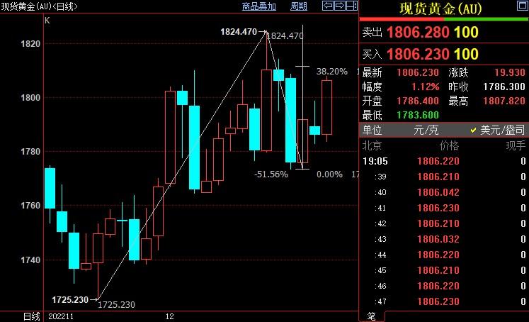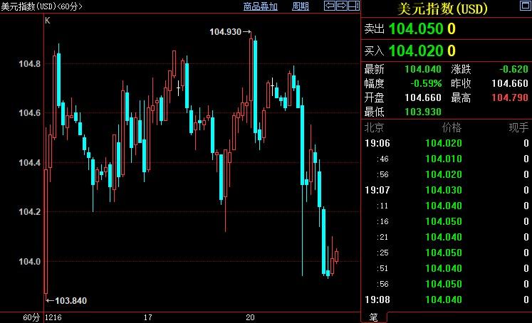 北京时间19:06,现货黄金上涨1.02%至1805.77美元/盎司;COMEX期金主力合约上涨0.98%至1815.3美元/盎司;美元指数下跌0.60%至104.041。