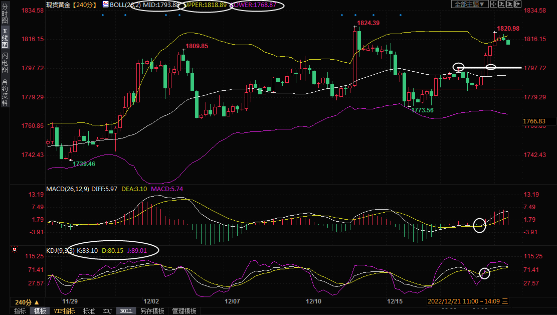 4小级别:震荡;金价涨至布林线上轨附近后上涨动能有所减弱,KDJ也运行至超买区域,短线金价面临一定的回调风险,布林线中轨支撑在1793.90附近,如果失守该支撑,则金价可能会进一步试探布林线下轨1768.86附近支撑。短线的恶化,1784.53附近也还存在一些支撑。