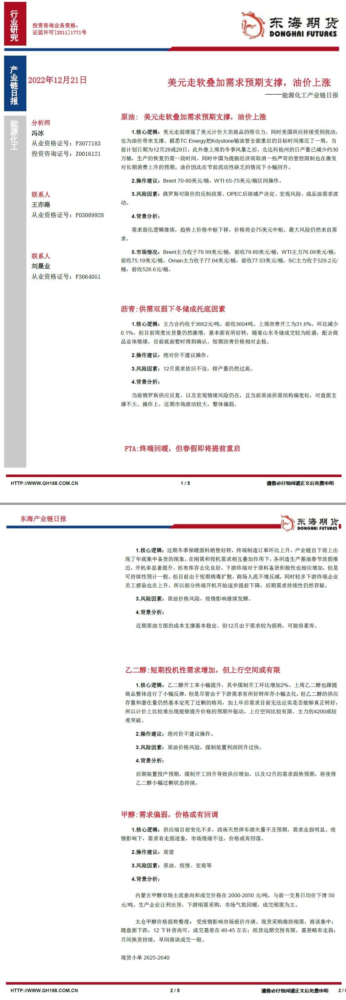 标题:【东海期货12月21日产业链日报】能化篇:美元走软叠加需求预期支撑,油价上涨