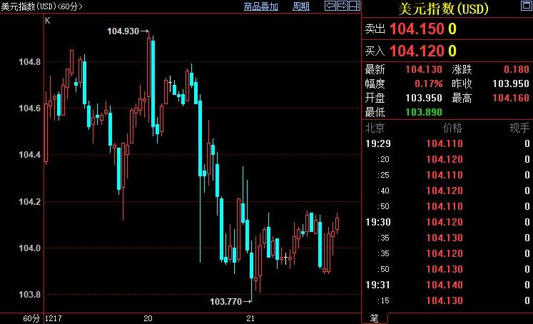 北京时间19:30,现货黄金下跌0.33%至1812.96美元/盎司;COMEX期金主力合约下跌0.21%至1821.5美元/盎司;美元指数上浮0.15%至104.140。
