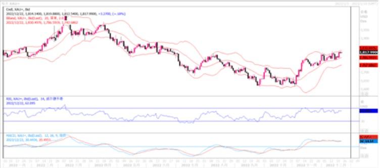 黄金日线图上,金价进入12月后,走势整体呈现宽幅震荡,期间价格虽然多次承压回落,但都坚守住了布林带中轨位置的关键支撑,随着布林带中轨与布林带上轨逐渐向上运行,黄金走势震荡向上的可能性有所增加。MACD指标在小幅死叉之后向上拐头,有重新形成金叉迹象,说明金价仍处于大幅上涨之后的调整阶段,RSI指标轻微金叉,KDJ指标金叉触及超买区域,黄金多方相对占优,但需要注意短线反复调整的需求。下方继续关注1810与1800美元支撑,上方关注1824美元阻力。