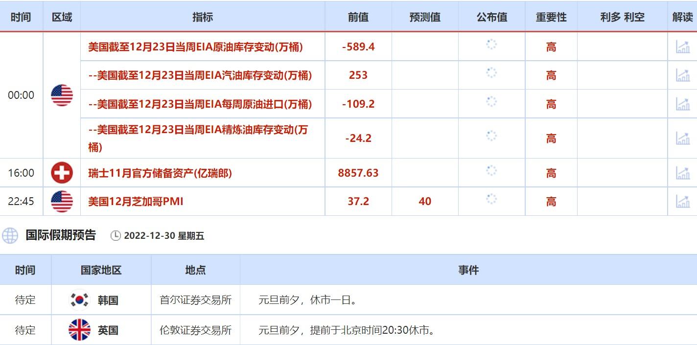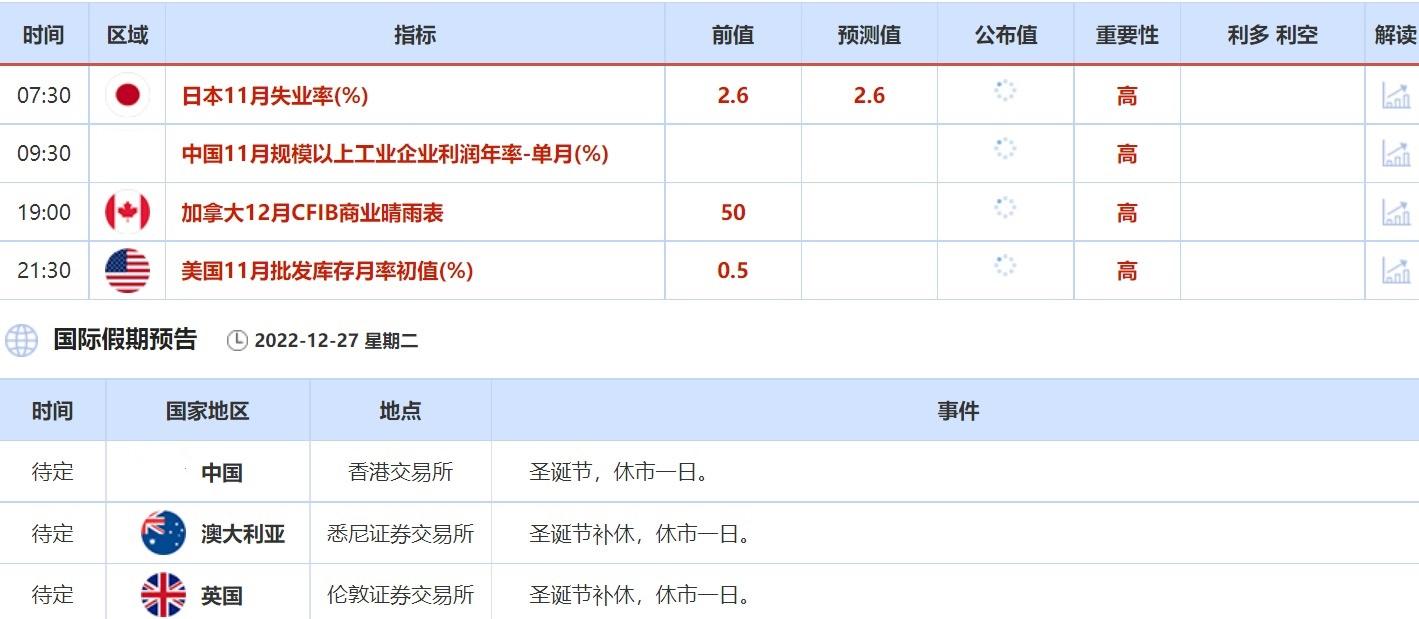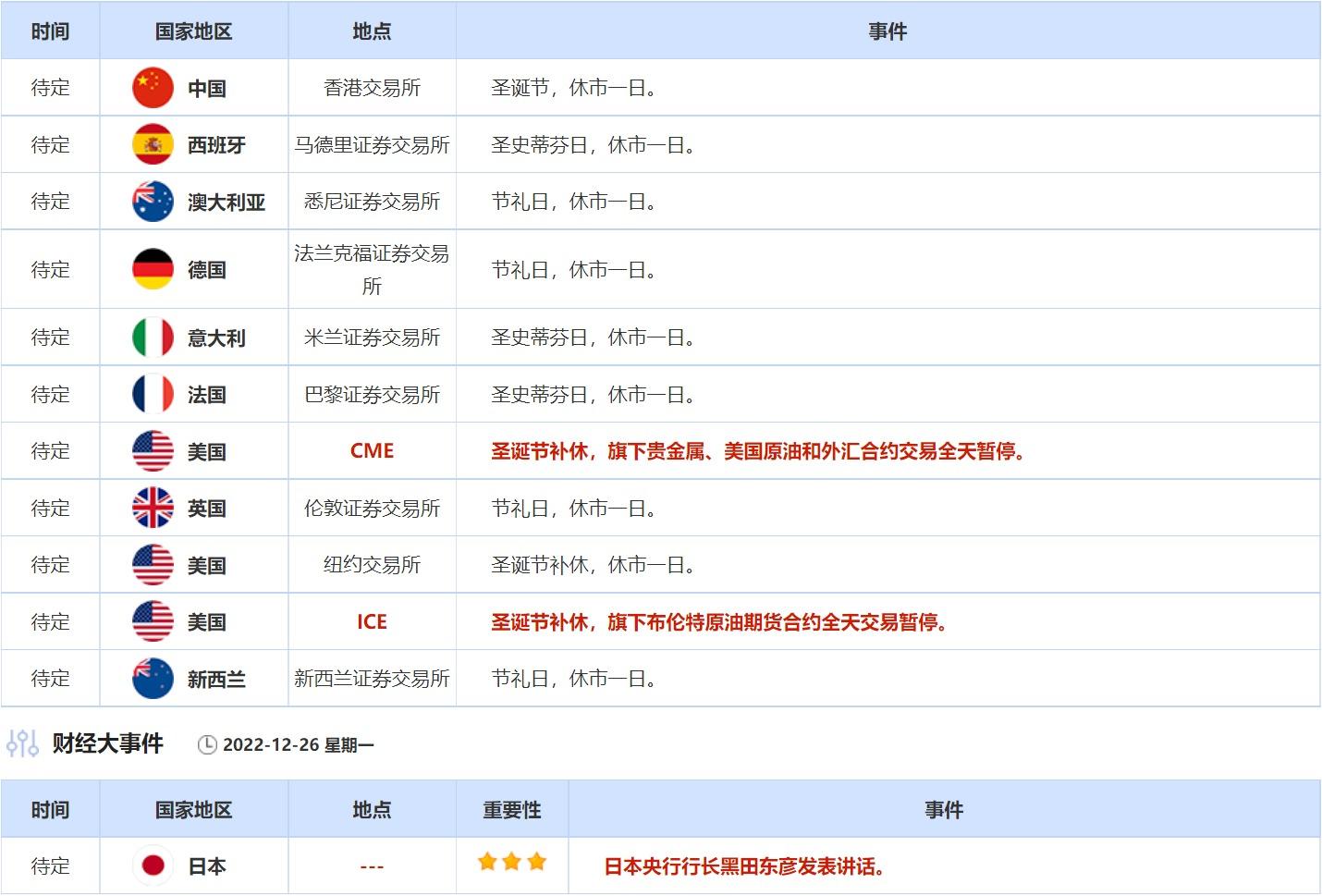 12月26日没有什么重点数据,但投资者需关注圣诞节假期全球各大交易所的休市公告。