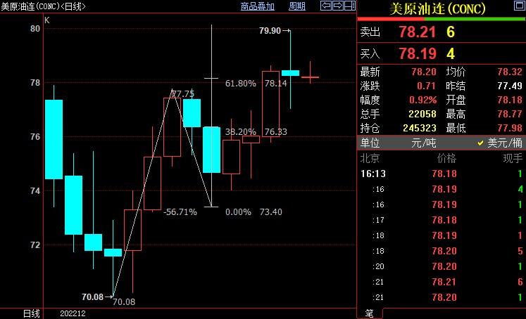 北京时间16:14,NYMEX原油期货上涨0.94%至78.23美元/桶;ICE布伦特原油期货上涨0.63%至82.16美元/桶。