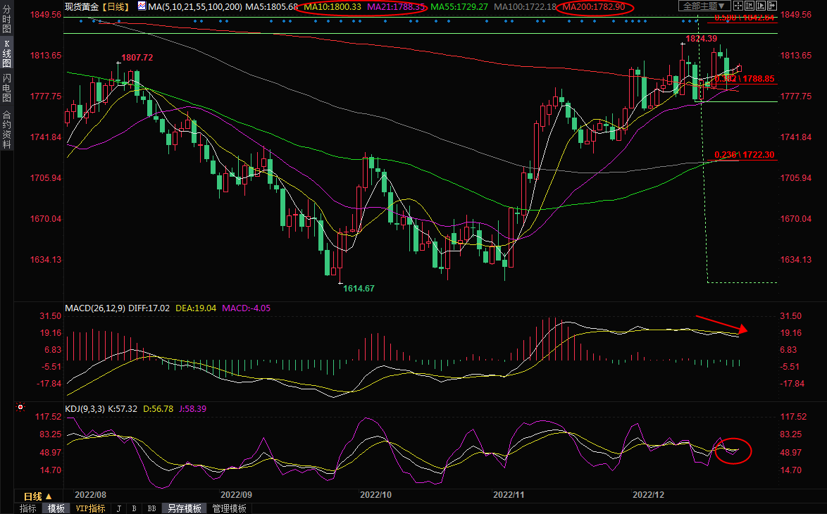 目前来看,金价并没有大幅冲高的动能,仍需提防冲高回落的可能性,10日均线1800关口目前是初步支撑所在,21日均线支撑在1788.34附近,若失守该支撑,则增加短线看空信号,进一步支撑在200日均线1782.90附近,12月15日低点支撑在1773.56附近。