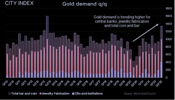 通胀飙升促使各国央行囤积黄金,使今年第三季度的黄金需求达到2021年的两倍多。此外,他们在第三季度的需求也是创纪录的。