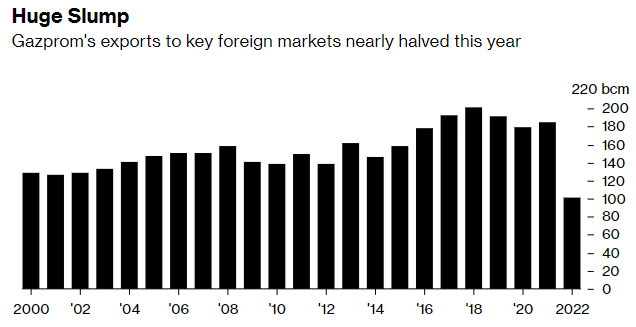 在产量方面,米勒周三表示,俄气2022年的天然气产量预计为4126亿立方米。根据该公司的历史数据,这将比2021年的5148亿立方米减少近20%,同时也至少是2008年以来的最低水平。