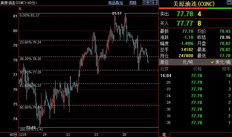 北京时间16:05,NYMEX原油期货下跌1.52%至77.76美元/桶;ICE布伦特原油期货下跌1.54%至82.70美元/桶。