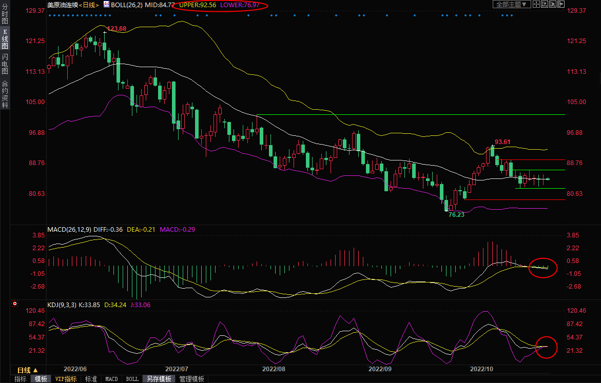 日线级别:震荡;均线交织,MACD粘合,KDJ粘合,油价连续数个交易日在布林线中轨附近窄幅震荡,短线缺乏明确方向,留意82.06-87.09区域突破情况,这是近一周油价的低点支撑和高点阻力所在。