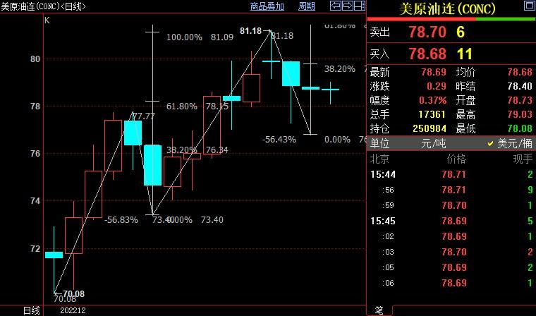北京时间15:45,NYMEX原油期货上涨0.31%至78.64美元/桶;ICE布伦特原油期货上涨0.40%至83.79美元/桶。