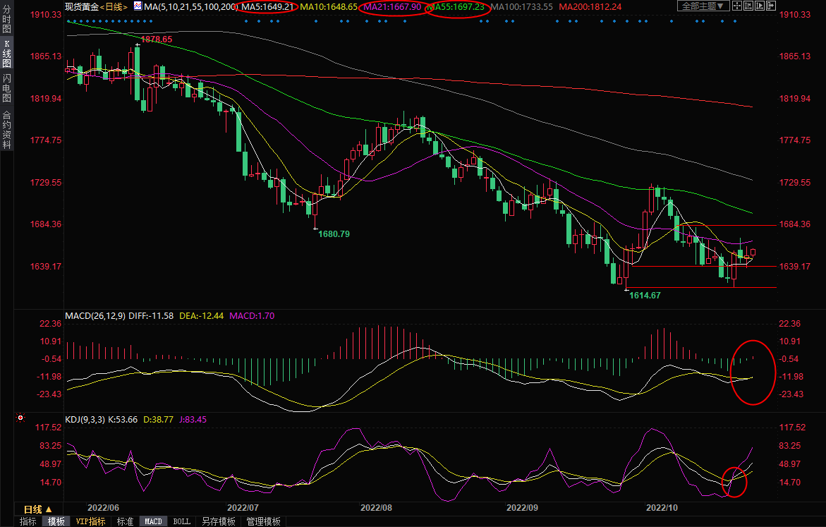 下方5日均线支撑目前在1649.21附近,隔夜低点支撑在1638.18附近,若意外回落至该位置下方,则削弱短线看涨信号。
