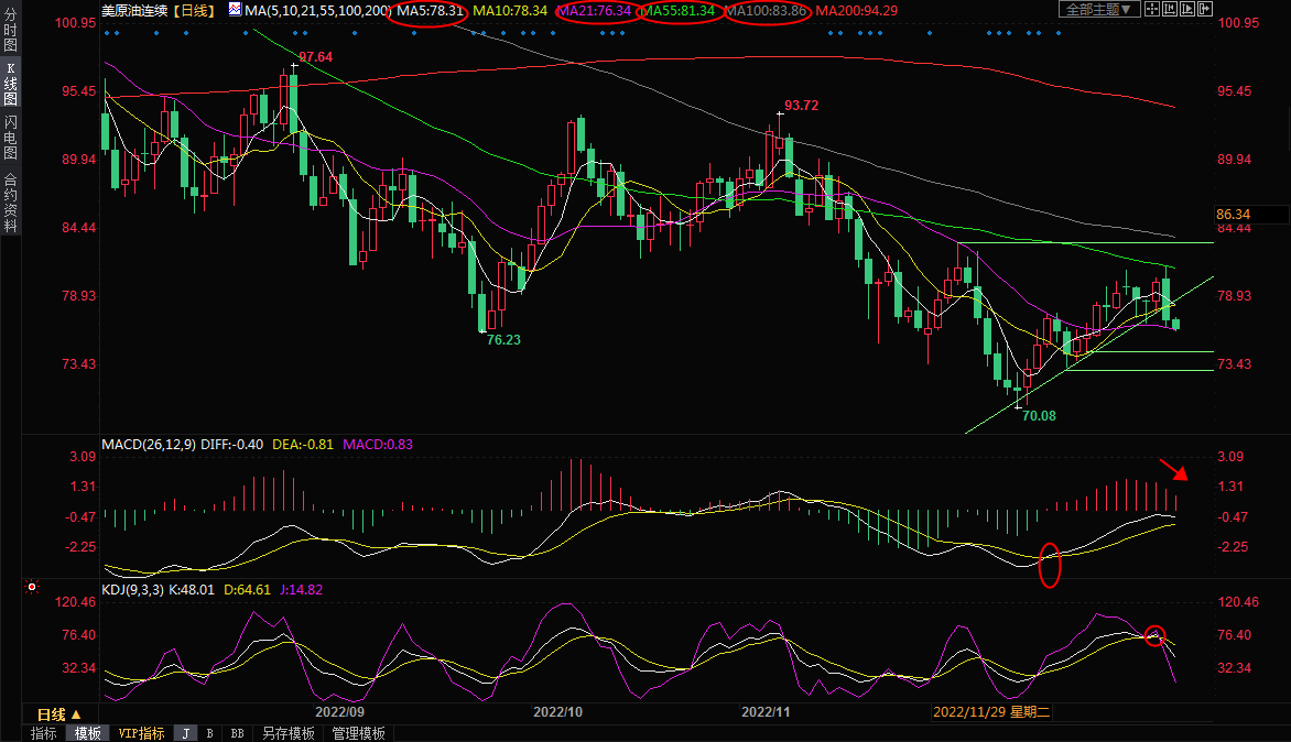 日线级别:震荡;油价上一交易日受到55日均线压制后大幅走弱,跌破了70关口以来的短线上涨趋势线,录得大阴线,基本宣告过去一周的震荡走势结束,KDJ重新结成死叉,短线看空信号显著增加,目前正试探21日均线76.34附近支撑,预计跌破该支撑的可能性较大,进一步支撑参考12月20日低点74.44附近支撑,12月16日低点支撑在73.31附近,布林线下轨支撑在71.39附近,该位置支撑相对较强,能否进一步下破还有待观察。