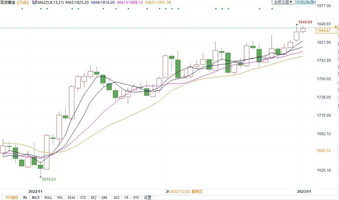 北京时间1月4日14:27,现货黄金报1844.99美元/盎司