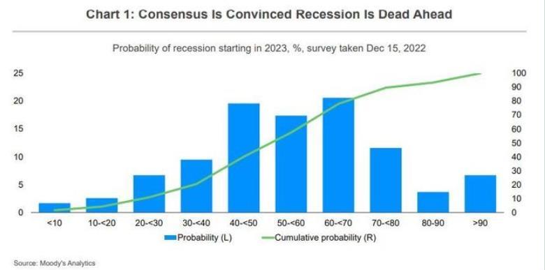 《华尔街日报》一项调查的预测中值显示,经济学家认为美国经济2023年陷入经济衰退的几率约为65%。